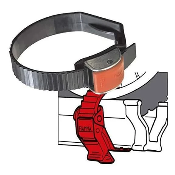 La cinghia di ricambio per portabici Fiamma Quick-safe è scorrevole e permette di immobilizzare la ruota sulla guida in modo rapido e sicuro. Viene fornita con un pulsante di rilascio immediato.