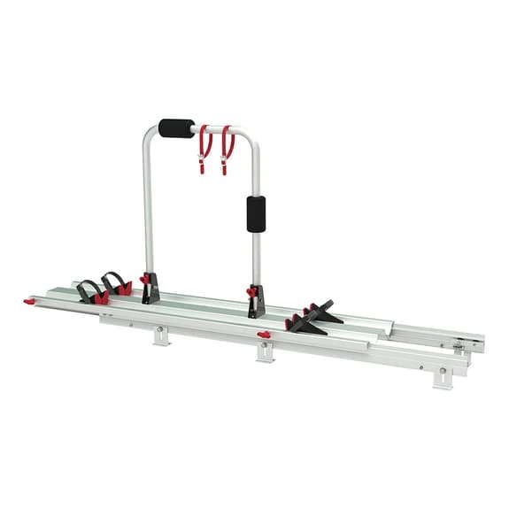 Il portabici Fiamma Garage Slide Pro-Bike per 2 biciclette è scorrevole e realizzato in alluminio anodizzato per mantenere le tue biciclette al sicuro nel vano portaoggetti del camper. Facile da installare.