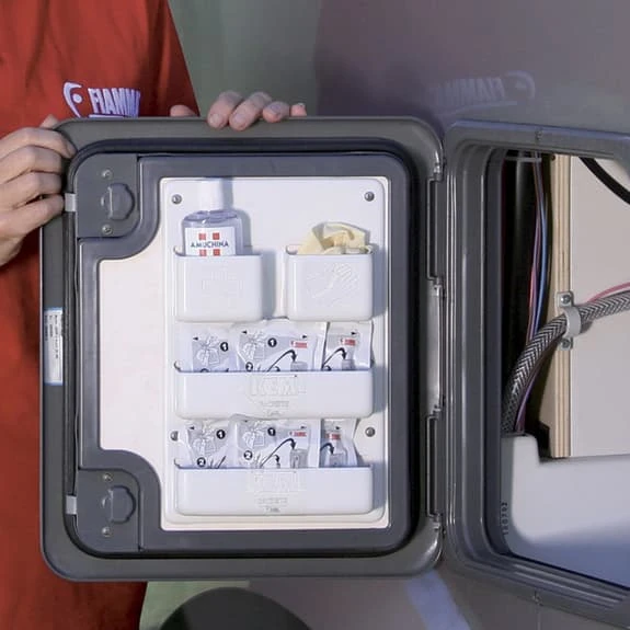 Lo scomparto Fiamma Pocket Kassett è un comodo modulo di quattro tasche portaoggetti singole. Si installa con viti che diventano di serie nella porta del Kasset Thertford o Dometic del veicolo.